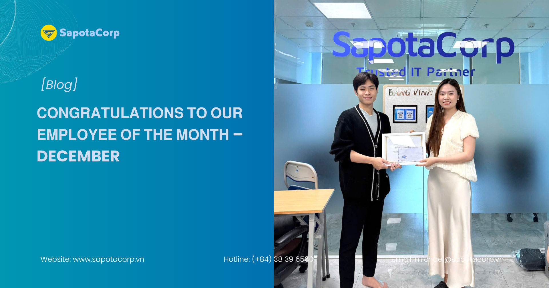 In addition to his strong work ethic, Dung is also a supportive colleague who maintains a positive attitude and collaborates effectively with teammates. He is always willing to assist others, share knowledge, and contribute to a productive and cooperative working environment. His presence has brought meaningful value to the projectโs ongoing success.His continuous efforts, commitment, and professionalism are truly appreciated by SapotaCorp. We are proud to recognize his achievements and grateful for everything he has contributed.